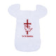On a sateen cotton base fabric this bib is embroidered. The cross and dove design with the words I baptize you. To be placed on the baby.