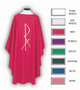 This polyester chasuble features a cross emblem with a wheat stalk intersecting its left arm. The lower portion of the vertical arm features the Greek letters alpha and omega, which symbolize the eternal presence of God. The garment is available in eight different colors to cover each of the liturgical seasons. The polyester material makes the chasuble lightweight and breezy while lending durability and wrinkle resistance.