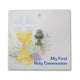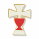 Gold-plated Chalice Lapel Pin with Wheat & Grapes. The chalice, grapes and wheat are the physical elements of the Holy Eucharist and this three dimensional brass First Communion pin truly emphasizes these special symbols. Measuring about 1/2"W x 3/4" tall the First Communion pin with chalice and grapes is the perfect finishing touch to a First Communion dress or suit. Individually Carded