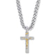 1-5/8 x 1 inch satin and antique finish sterling silver scroll ends crucifix necklace on a 24 inch stainless steel rhodium plated chain. The crucifix pendant features a raised figure of Jesus Christ on the cross, with curved scroll end detailing on the ends. The crucifix ends also feature diamond drag engraved detailing and black antique finishing.