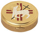 24k gold plated, satin finish outside, bright finish inside with oxidized silver emblem. Slip-on cover. 4˝ dia., 35 host cap. Use with burse K-3148.