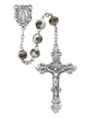 8MM AQUA CRYSTAL BEADS WITH FLOWER OUR FATHER BEADS AND SILVER OX CRUCIFIX AND CENTER. INLUDES A DELUXE GIFT BOX.